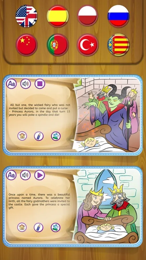 • The story: Read and listen to the story by pressing the audio button to play the sound. The audio is available in English, Spanish, Chinese, Polish, Portuguese, Russian, Valencian and Turkish, accompanied by beautiful background music and sound effects.