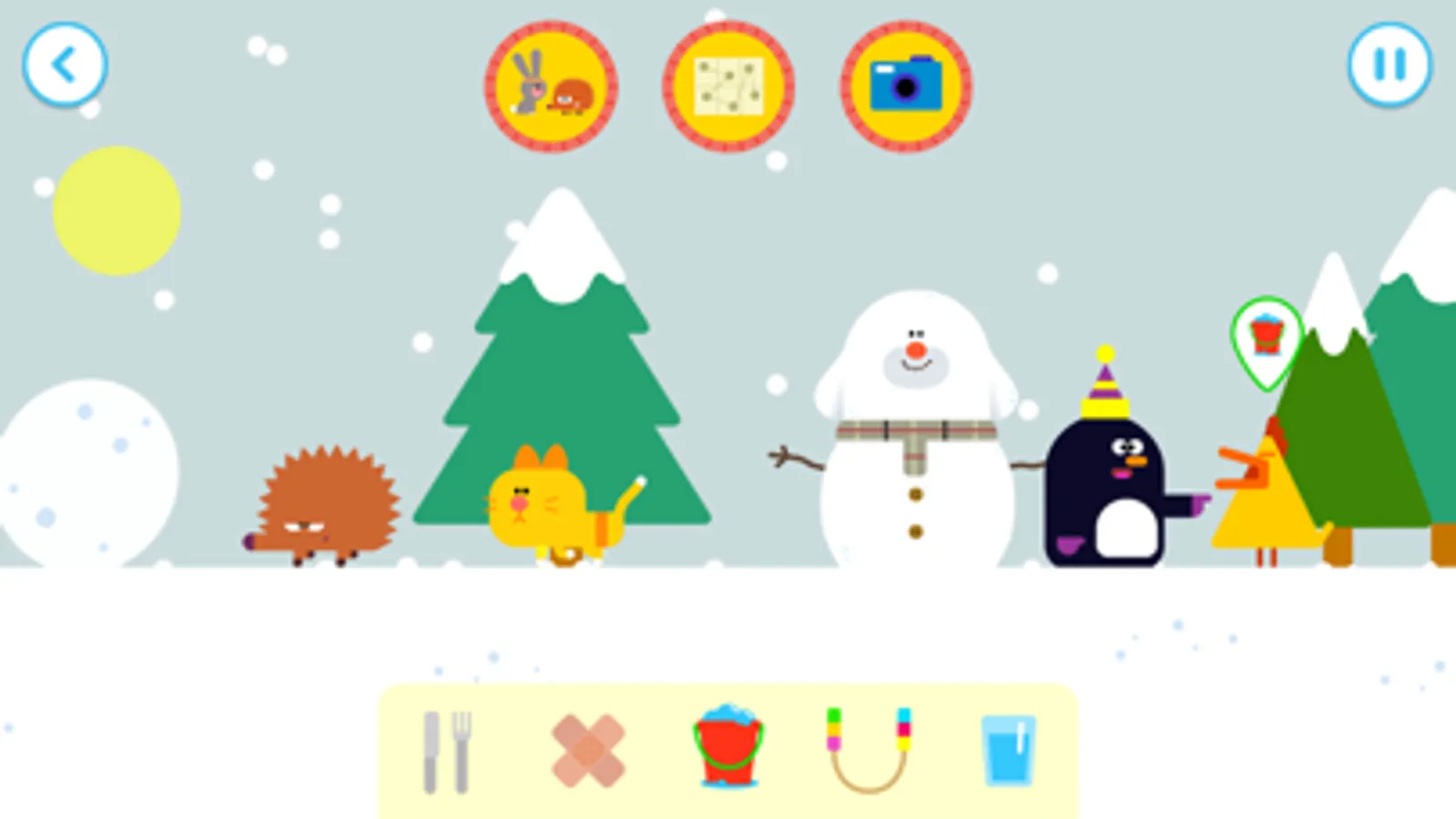 • Five locations to visit: a park, some woods, the beach, the snow and a field;