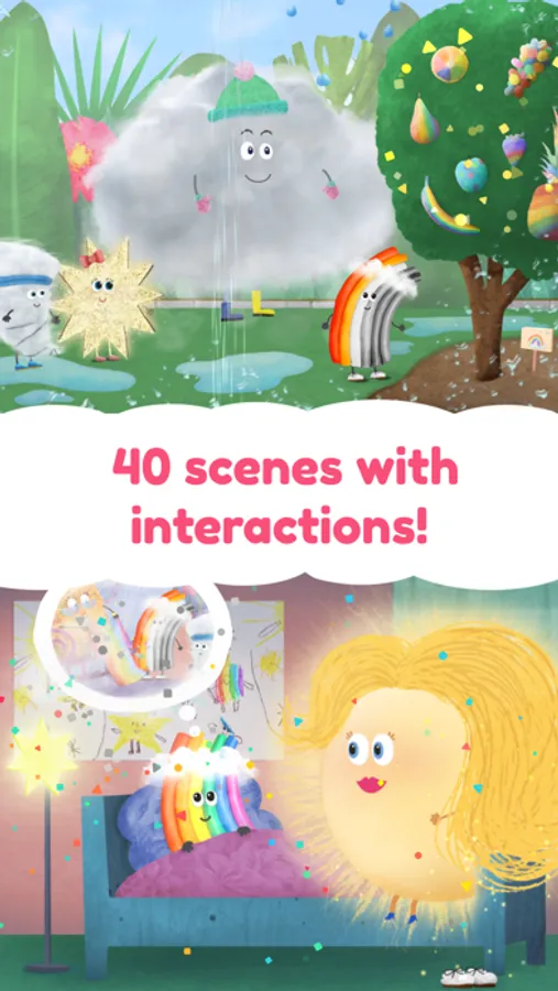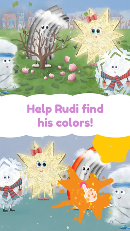 Oh dear, Rudi the Rainbow lost his colors. Join him on an adventurous search in this fun, interactive storybook app! Help Rudi find his colors and learn about the weather and space: Meet cute characters, learn how wind or rain are formed and apply your knowledge in 6 fun mini games! The children's app "Rudi Rainbow and the lost colors" consists of 40 scenes with hidden objects, animations and sounds.