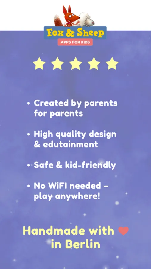 We are a Studio in Berlin and develop high quality apps for kids at the age of 2-8 years. We are parents ourselves and work passionately and with a lot of commitment on our products. We work with the best illustrators and animators around the world to create and present the best apps possible – to enrich the lives of our and your kids.