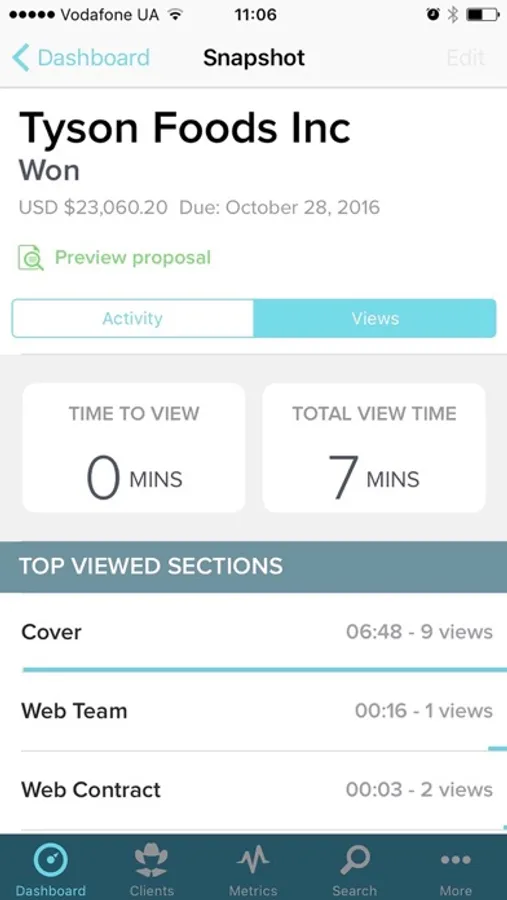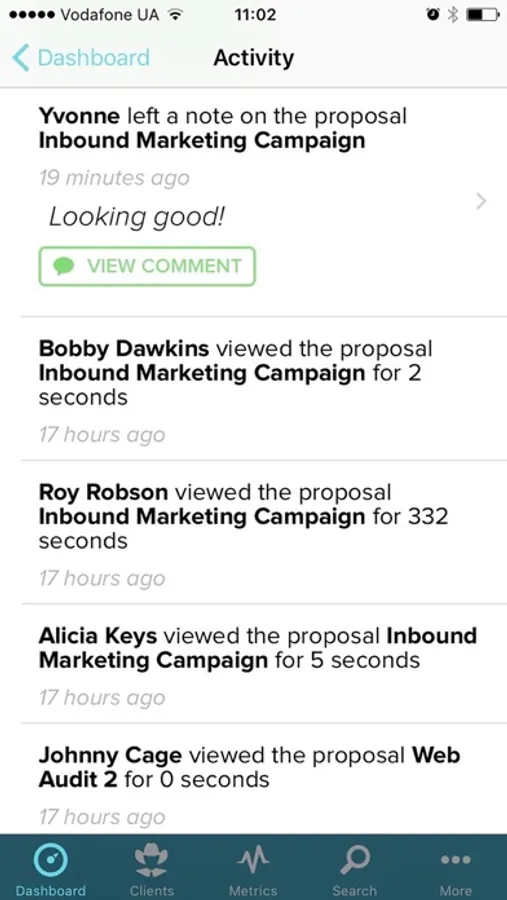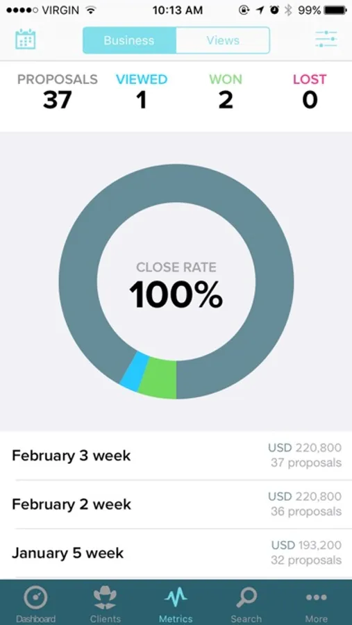 This mobile companion app enables Proposify users to stay on top of their sales pipeline, monitor proposal activity, and get more control and visibility over their closing process.