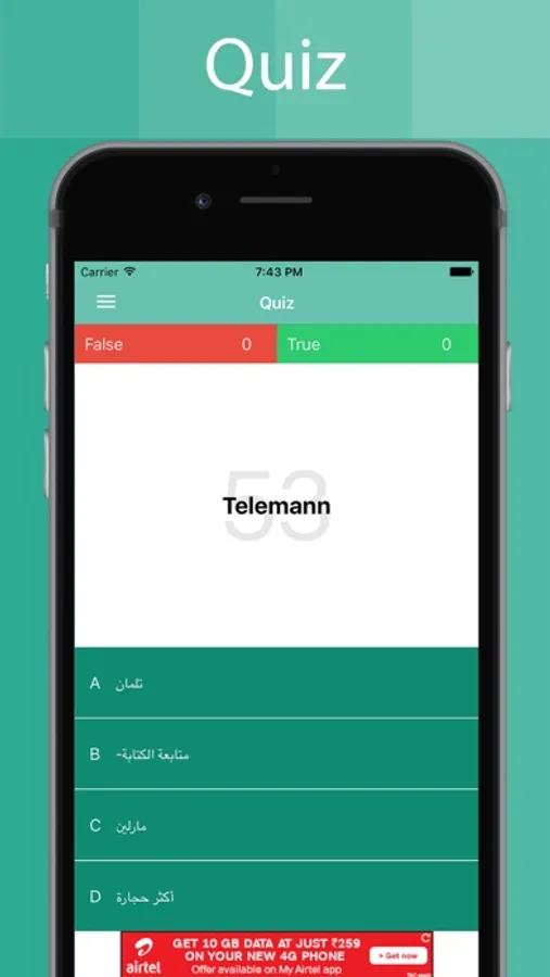 This Arabic Dictionary Contains Quiz too. you can test you Arabic skills using this multiple choice quiz and you can improve your Arabic.