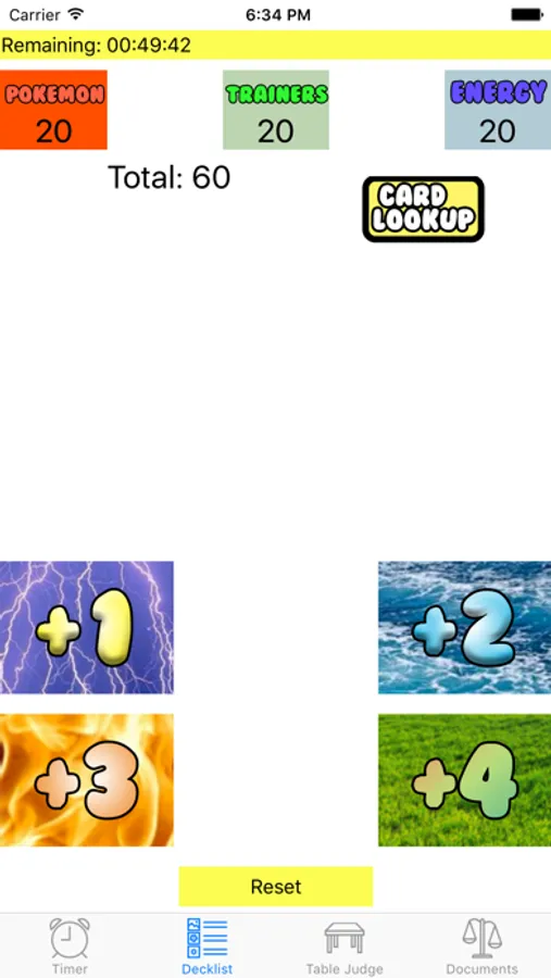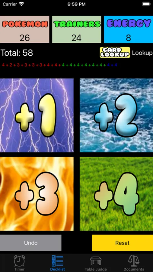 - A Deck List counter, specialized with buttons to add 1, 2, 3, or 4 to three categories of Pokemon, Trainers, or Energy. Makes counting 60 cards on a deck list easier.