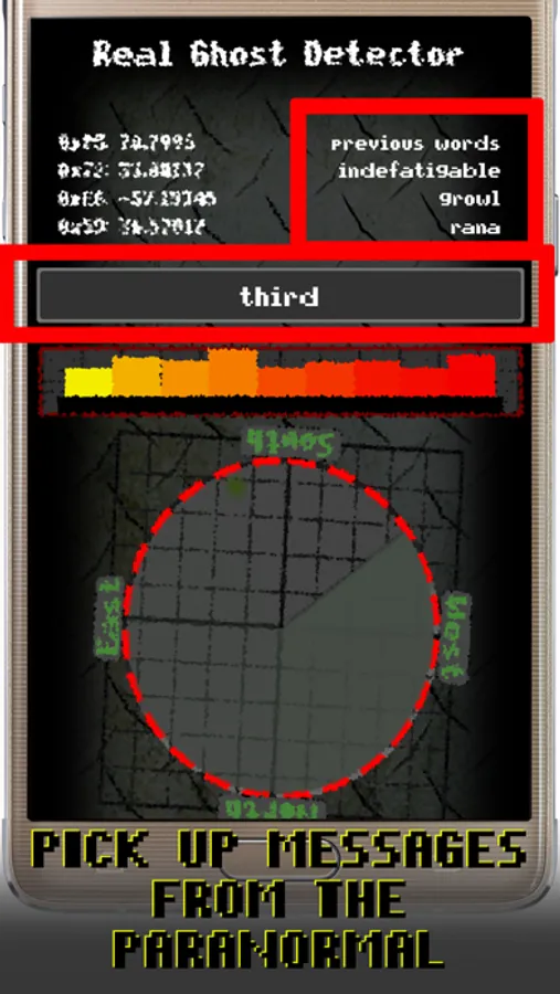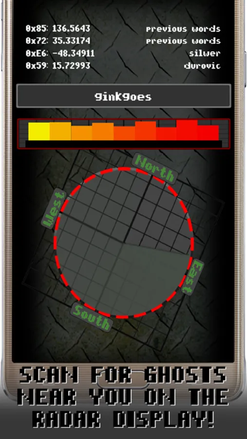 This is an app developed through rigorous trial and error testing, to allow smartphones to detect the presence of ghosts, and many other supernatural beings in the area near the device. Effective range is limited to roughly 500 meters (~0.311 miles), and accuracy cannot be guaranteed because of variations in sensors from device to device. Sometimes it helps to allow the app to run for a prolonged period of time for more accurate results. The radar type design approximates the location of nearby detected presences in nearly real time, with a unique color assigned to help identify and track additional entities as they come within scan distance. Effectiveness and range are slightly different among different devices, and running multiple instances nearby can cause interference and disturbances to the scanning process. Best used in low light, quiet areas, and often detects entities in areas you may have never suspected there to be any active apparitions. It's recommended to repeat scanning and spot checking across several weeks of time for the most effective results as there are sometimes electronic and magnetic disturbances which will temporarily prevent accurate data being collected. To be a real pro one should collect notes as well alongside the app for referencing which times and specific locations where the sensors detect useful information.
