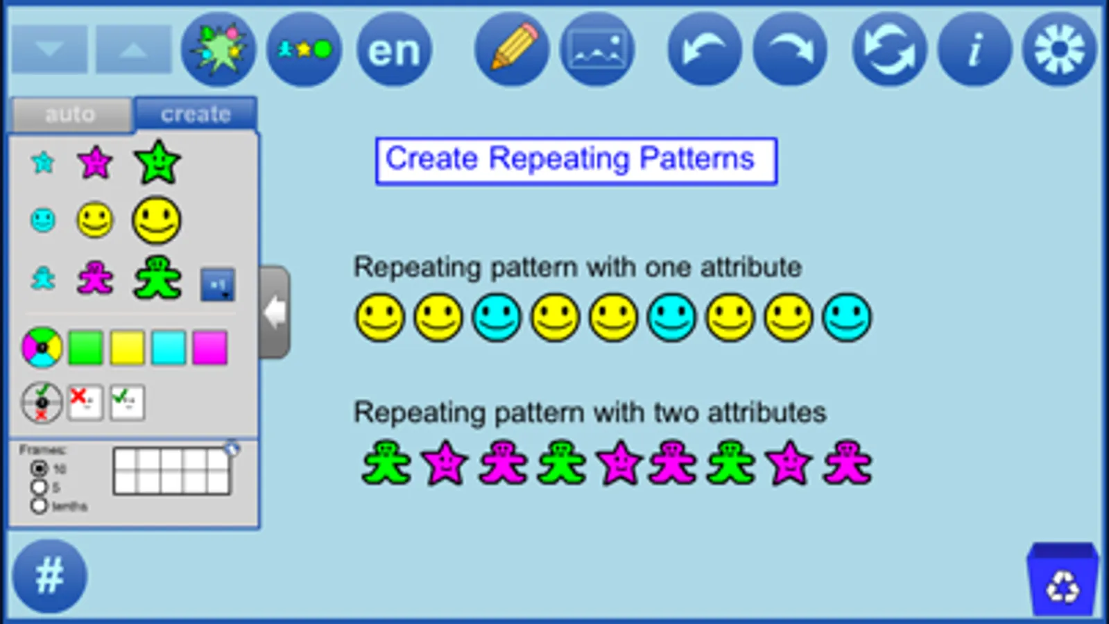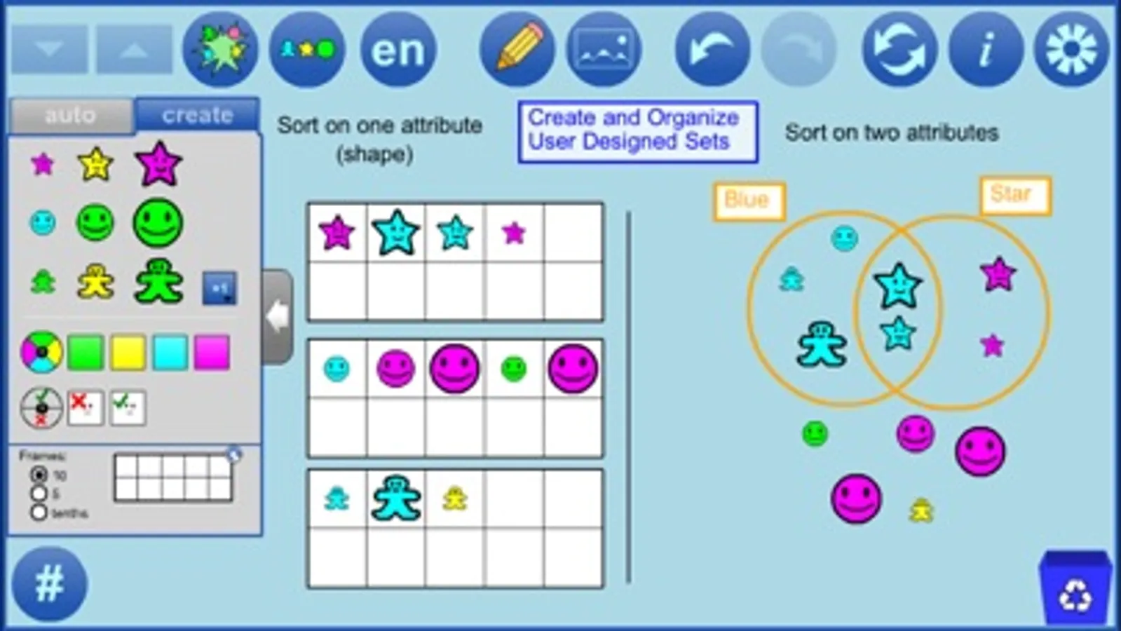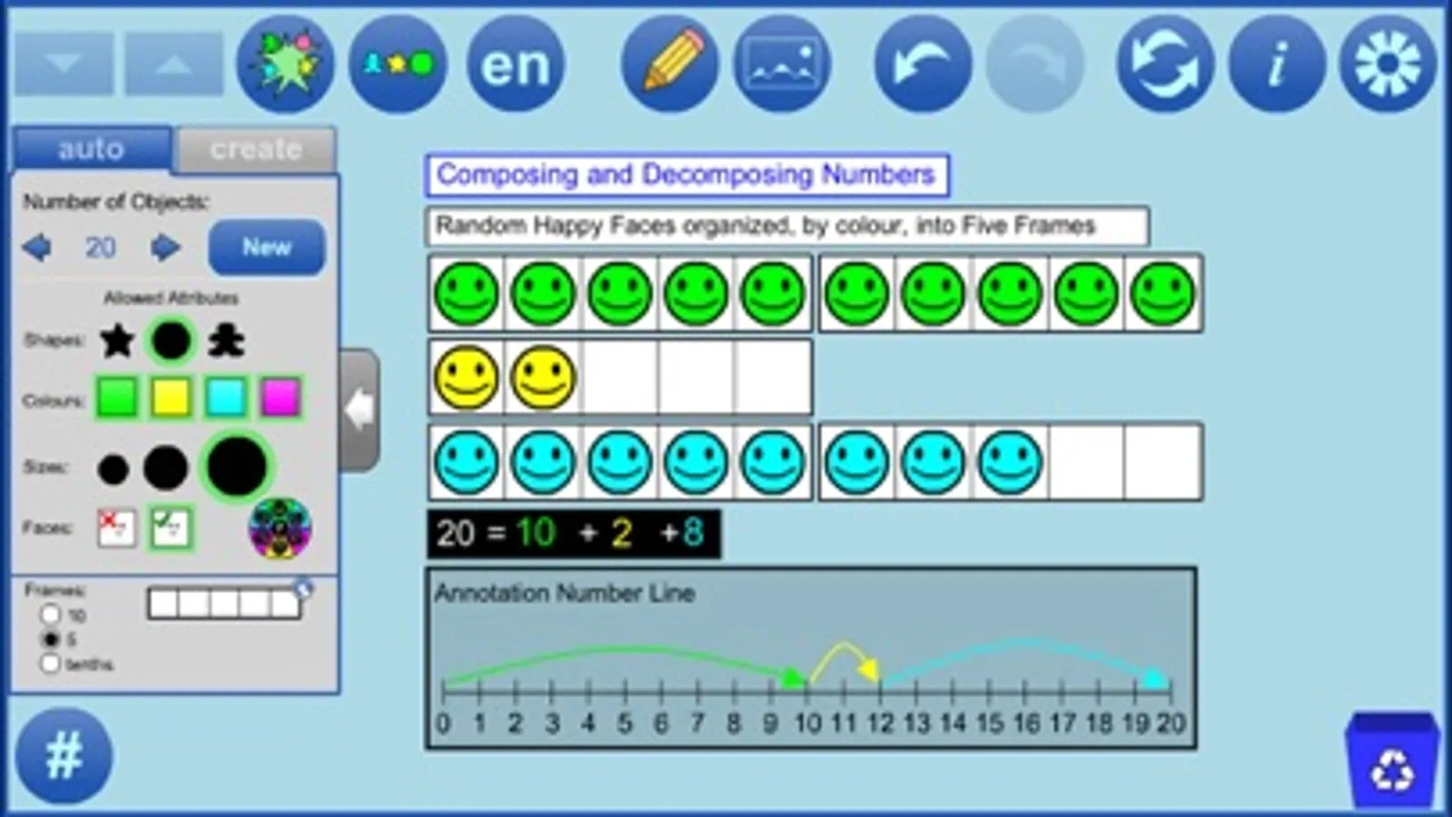 Sets of objects can be generated randomly or designed by the user. Sort and classify objects. Create patterns. Represent, compose and decompose whole numbers, tenths, and fractions. Explore experimental probability.