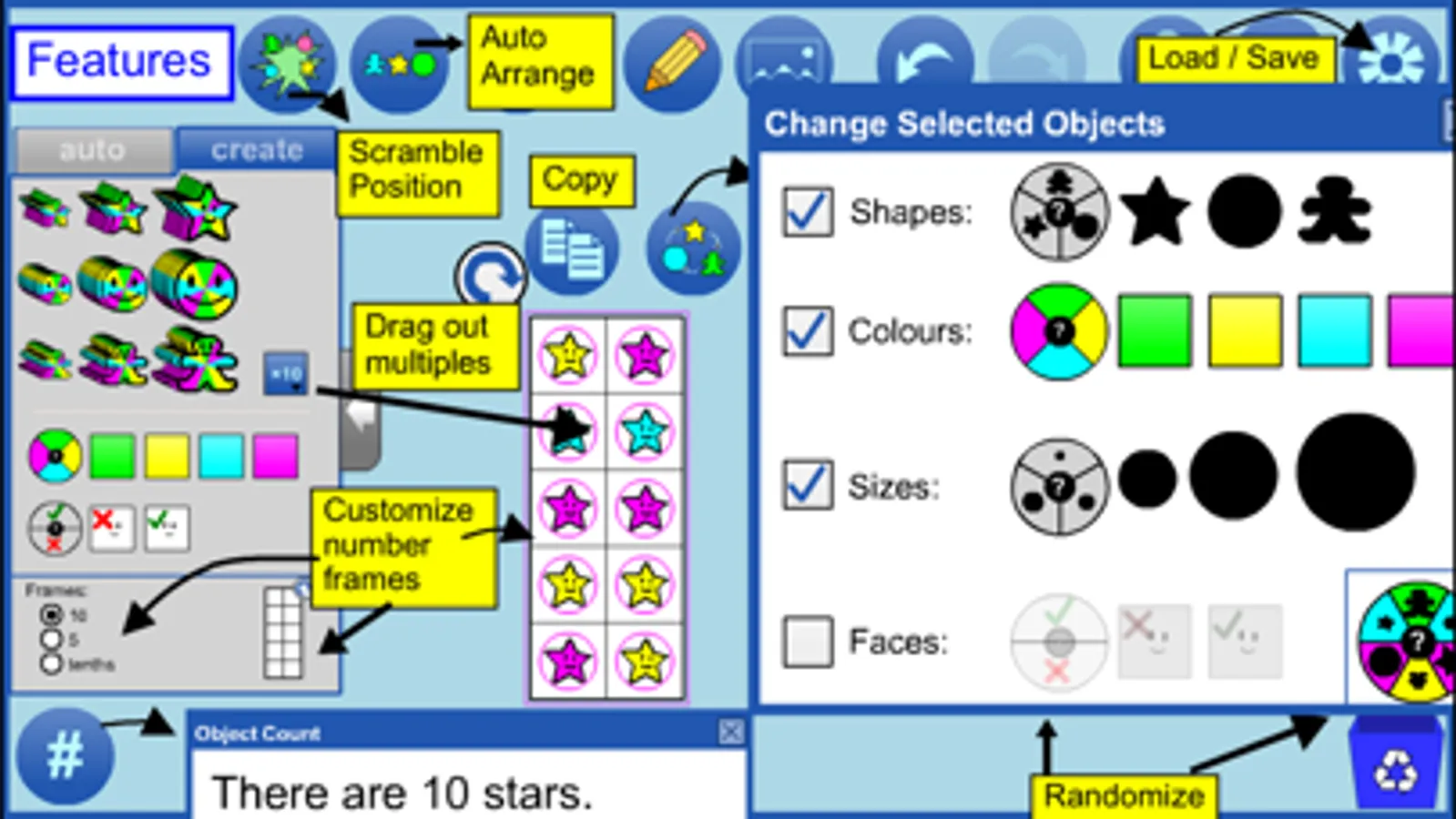 • Change the attributes of selected objects (shape, colour, size, facedness) specifically or randomly