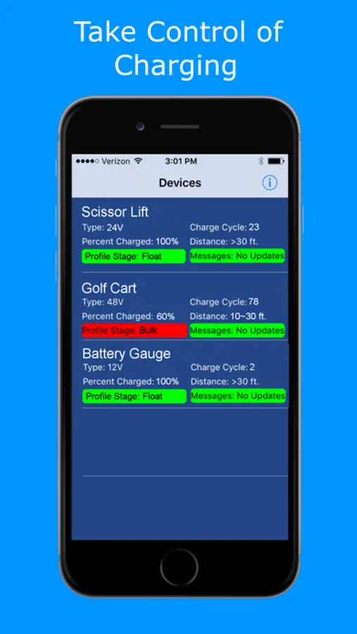 The DeltaView® Link mobile application allows the user to access stored charge profile information from any DeltaView® Link enabled Pro Charging Systems battery charger.