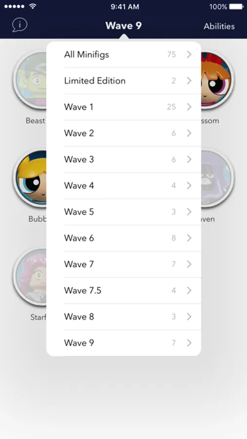 - Filter minifigs by wave by tapping on the "All Minifigs" title