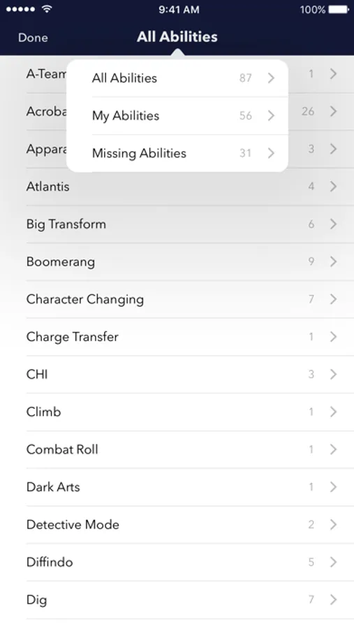 - Filter abilities to show All Abilities, My Abilities, or Missing Abilities making it easier to see which characters you need