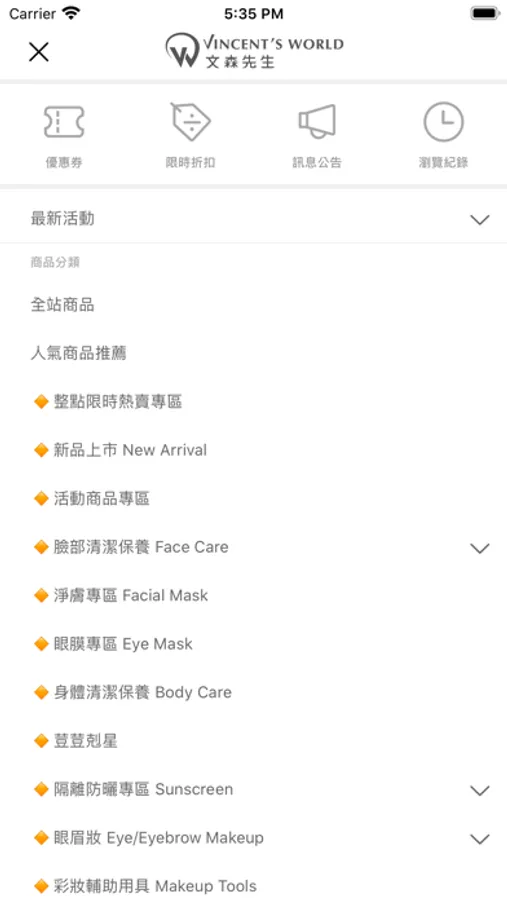 文森先生官方APP不定時推出限定優惠!APP會自動推播訊息,讓你不再錯過任何好康活動。文森先生用最高規格研發專屬於妳的美妝品,讓懶惰的妳也能擁有美麗;同時產品均經SGS檢驗合格,今天起,妳的美~VINCENT'S WORLD 來守護。量身推薦您最佳美妝品,就在文森先生 APP!