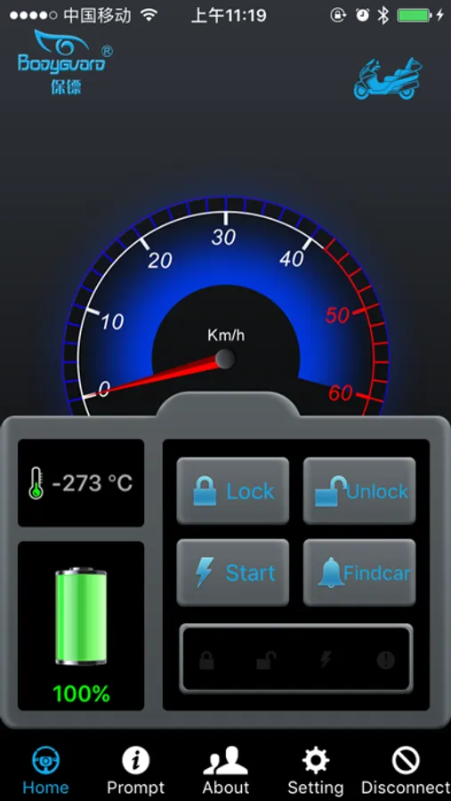 主页模块中,你可以了解到电动车的码数以及电量等信息,并且可以控制报警器。