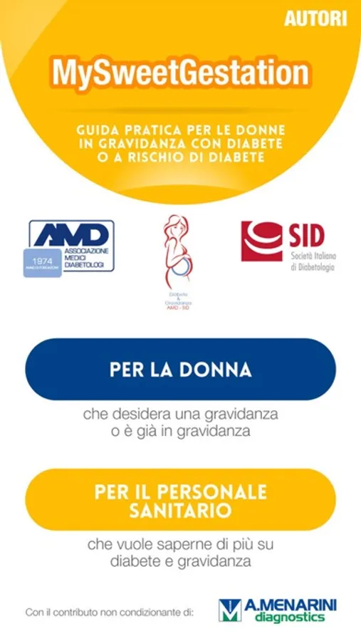 Questa APP è stata pensata e realizzata come strumento di consultazione dal gruppo di studio AMD-SID Diabete e Gravidanza con il contributo non condizionante di A. Menarini Diagnostics.