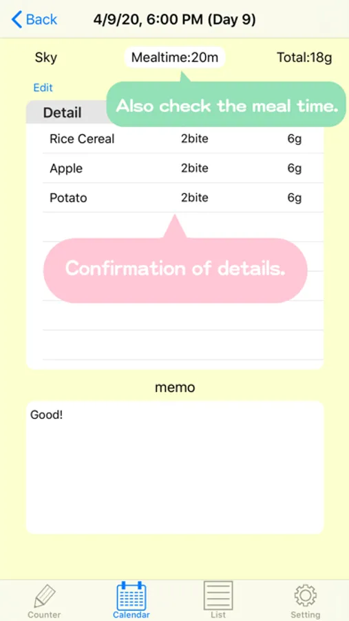 You can record the state of meals at the memo function.
