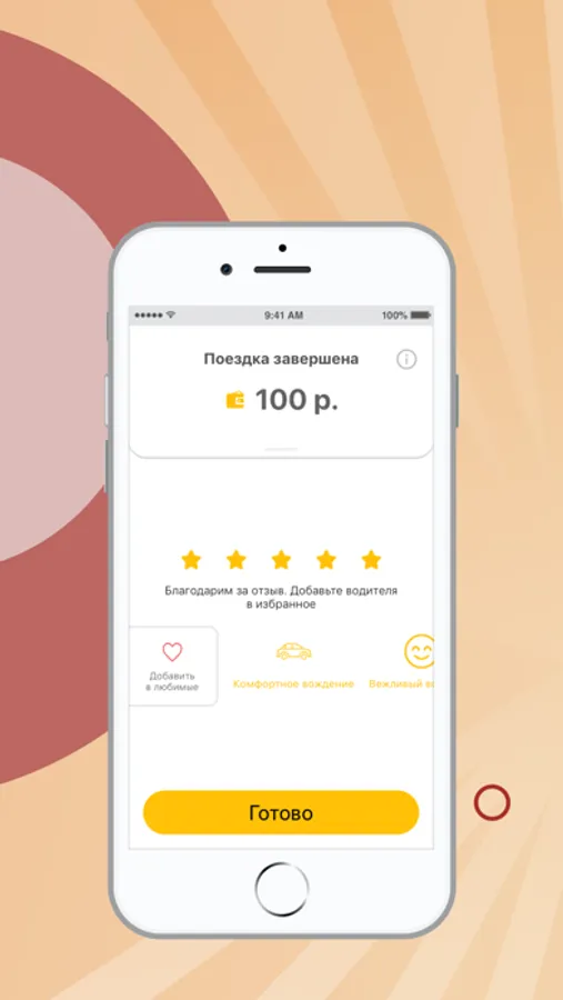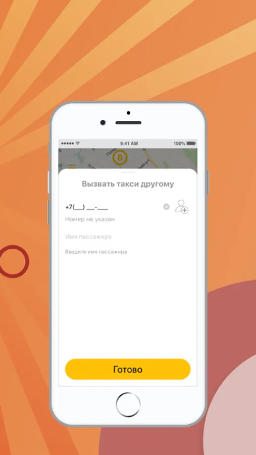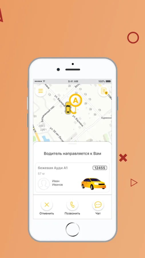 Следите за поездкой на карте. Приложение сообщит время подачи, марку, цвет, номер машины, а также имя водителя.