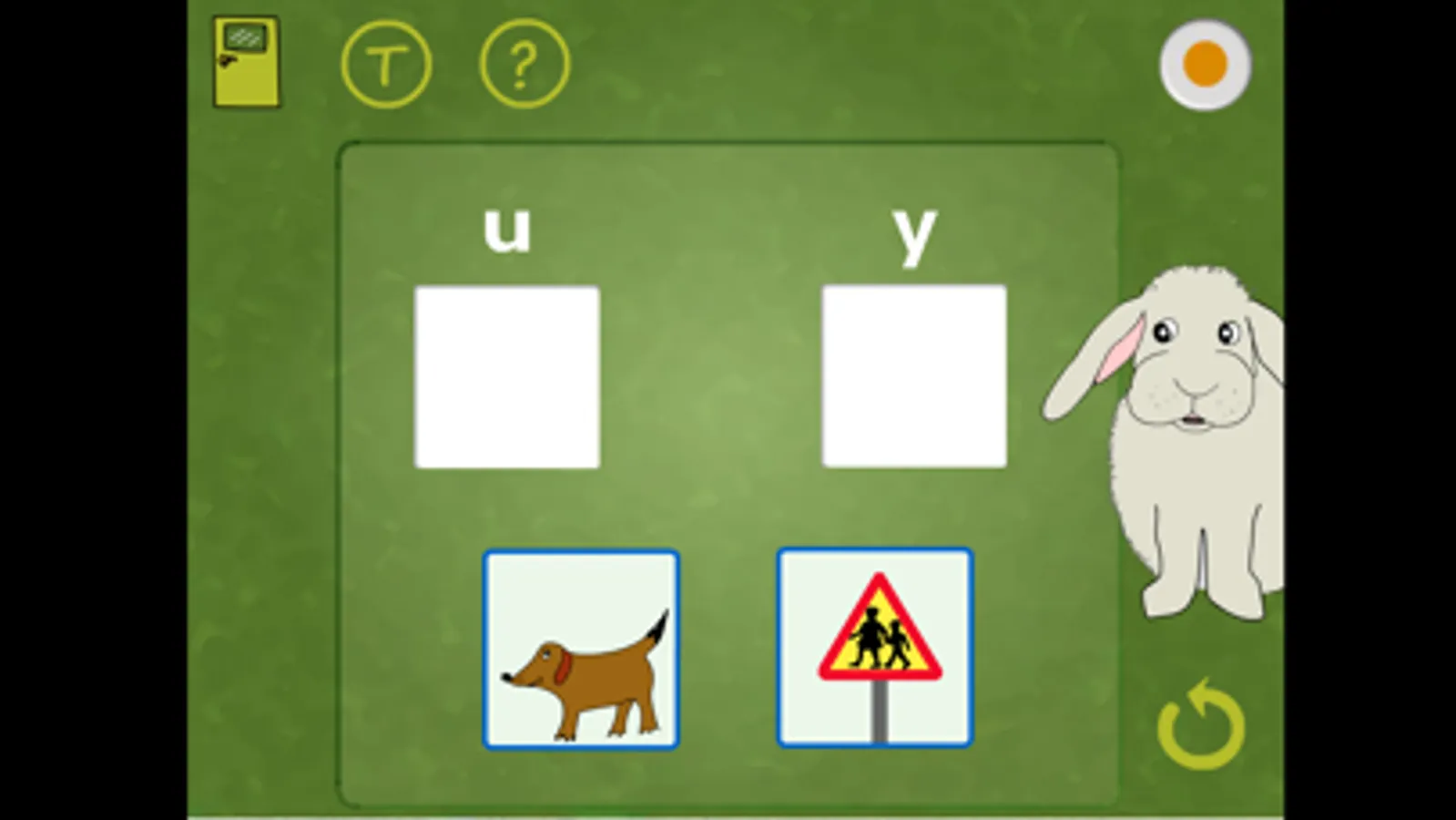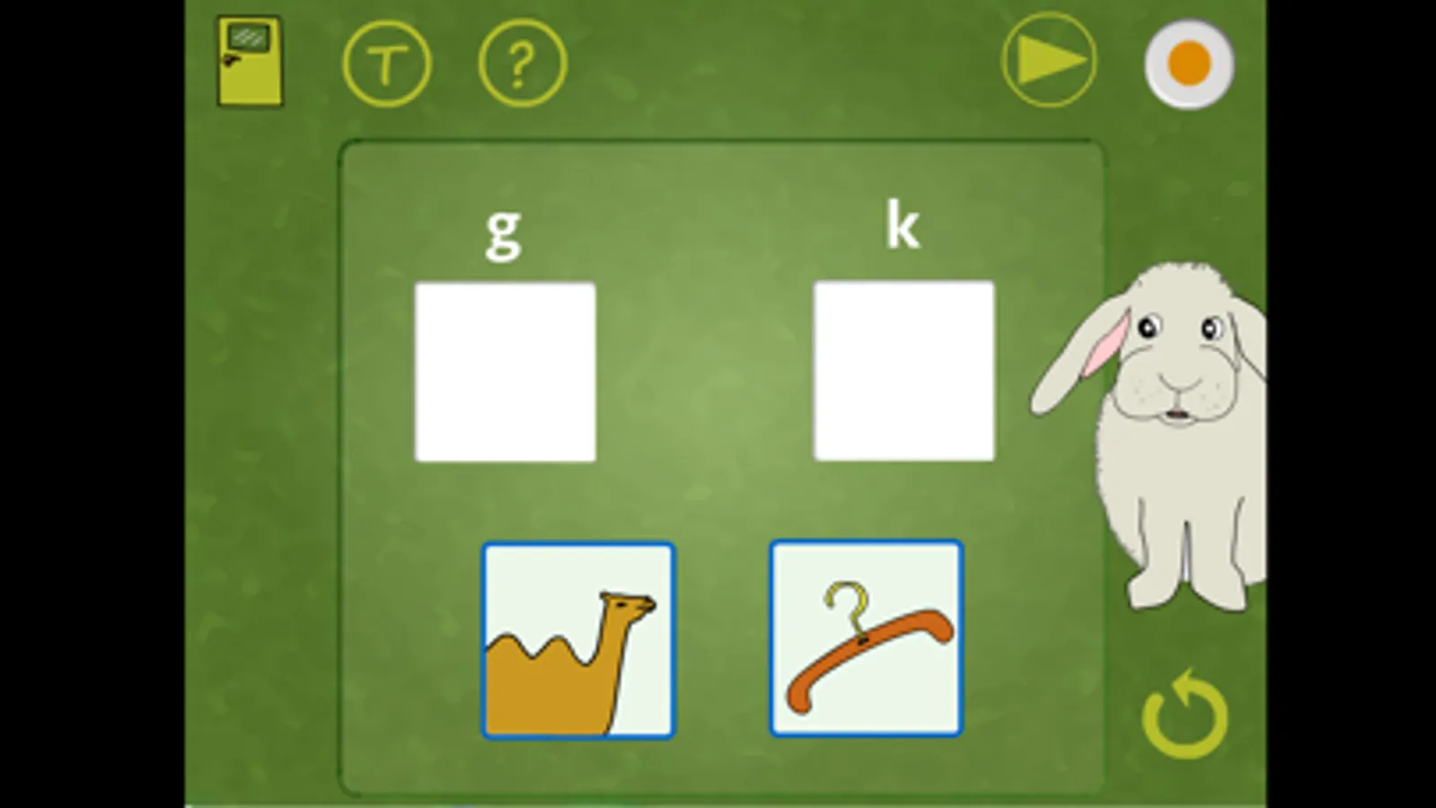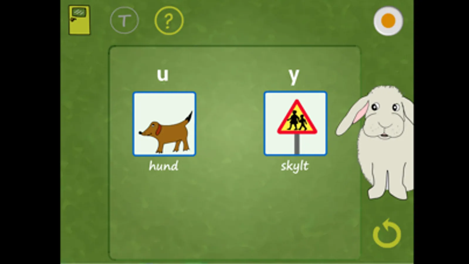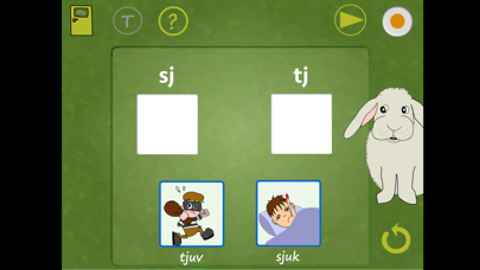 Kaninen säger till exempel: kan du höra vilken bokstav som är i mitten av orden? Sortera de två bildkorten med liknande bokstavsljud genom att trycka på dem, lyssna på ordet och dra bilderna till rätt bokstavsruta, till exempel "sjuk" till SJ-rutan och "tjuv" till TJ-rutan. Kaninen ger feedback som ”försök igen” eller ”bra”. Tryck sedan på “starta-om-pilen” så får du nya bilder att sortera.