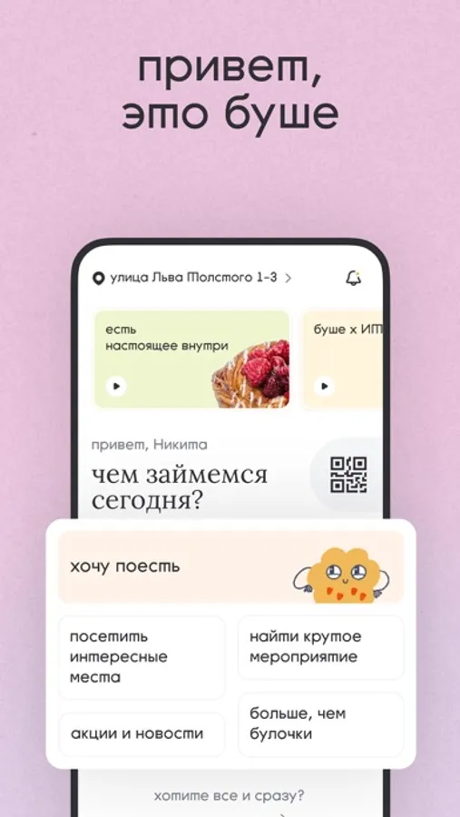 Это наше приложение-экосистема. Тут можно заказать доставку, пробить скидку по QR-коду, узнать о новинках буше и даже найти крутое мероприятие на выходные. В общем, задача у приложения простая – быть полезным.