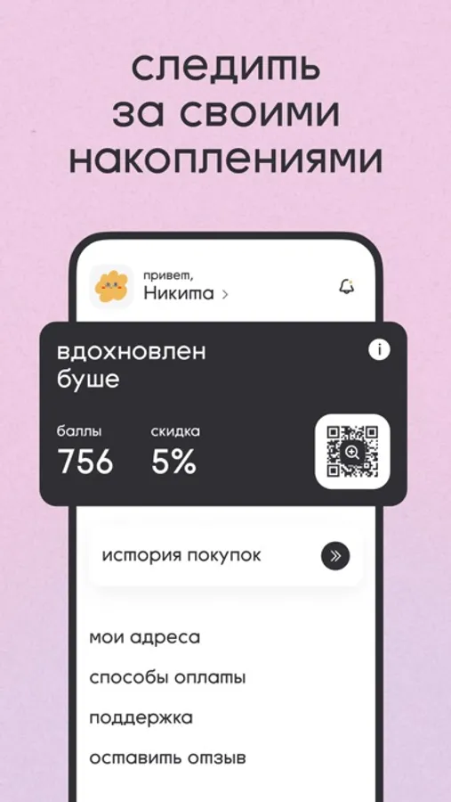 - твоя скидка всегда под рукой – есть быстрый доступ к QR-коду;