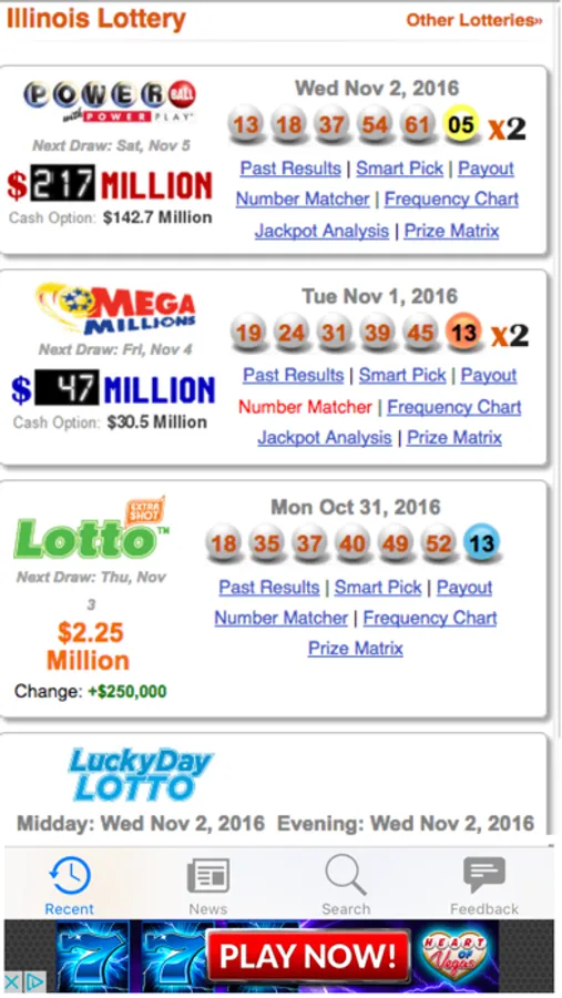 Get the winning lottery numbers for the Illinois Lottery (also known as the IL Lottery). Results for each game are updated every 5 minutes! You can save your favorite numbers, see hot and cold numbers, frequency charts, know how many people won each game, and receive push notifications, or search past results! The app is very simple and easy to use. So if you are a lottery player - download this app now and get the winning numbers!