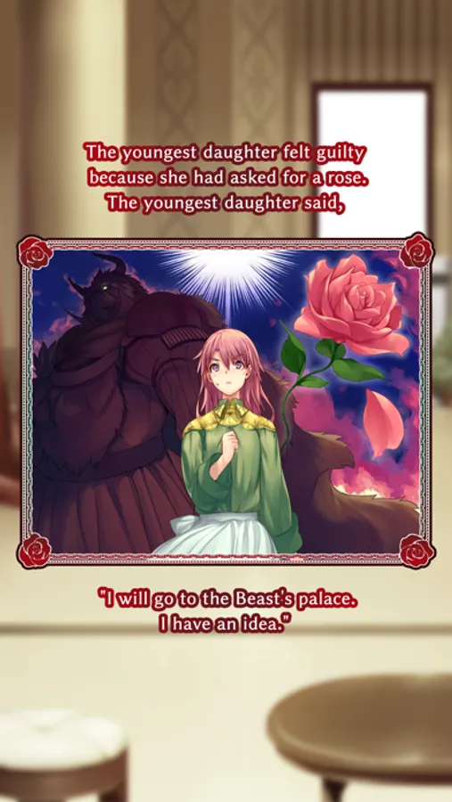Meanwhile, the wise and beautiful youngest daughter asked him to come back safely and to bring a rose.