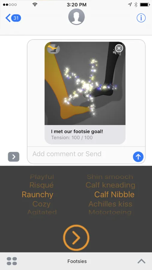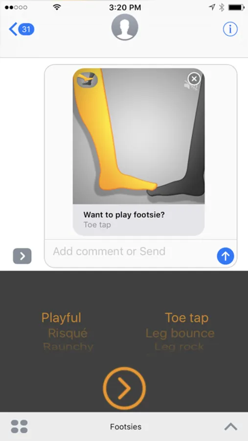 Have a blast playing Footsies for iMessage! Select from a variety of animated emoji-style footsie videos to exchange via interactive messages. Just open the App Drawer to start a new footsie game, or tap on an existing Interactive Message during gameplay to continue a session of Footsies. In-App Purchase available to unlock all available content.