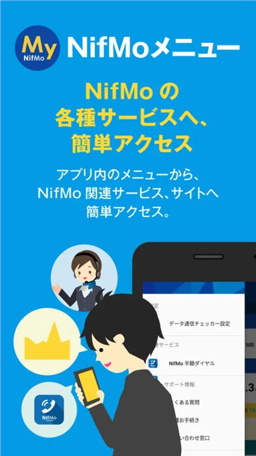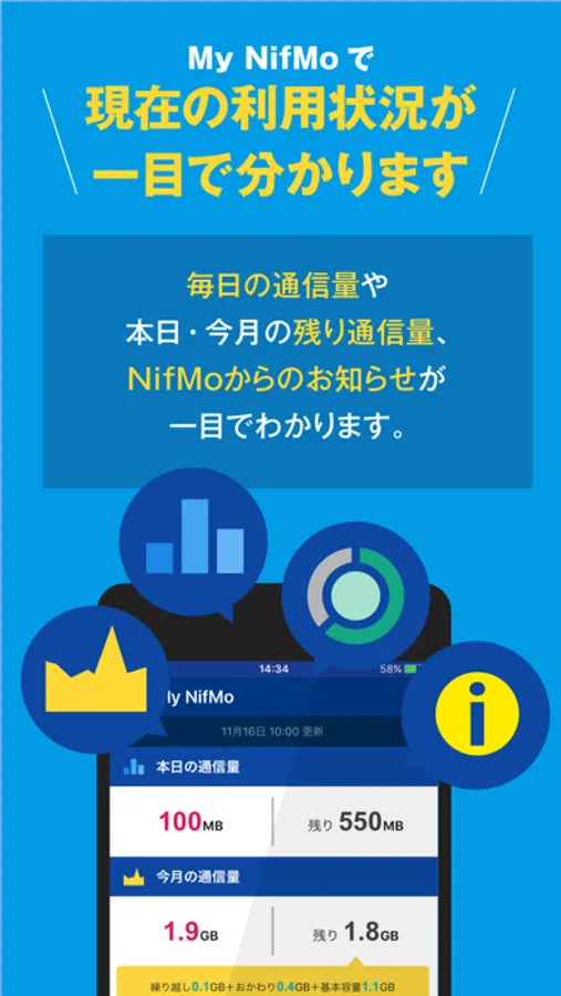 「My NifMo」は、通信量の確認や、NifMoに関するお知らせやサポート情報に簡単にアクセスできるNifMoユーザー必携のアプリです。