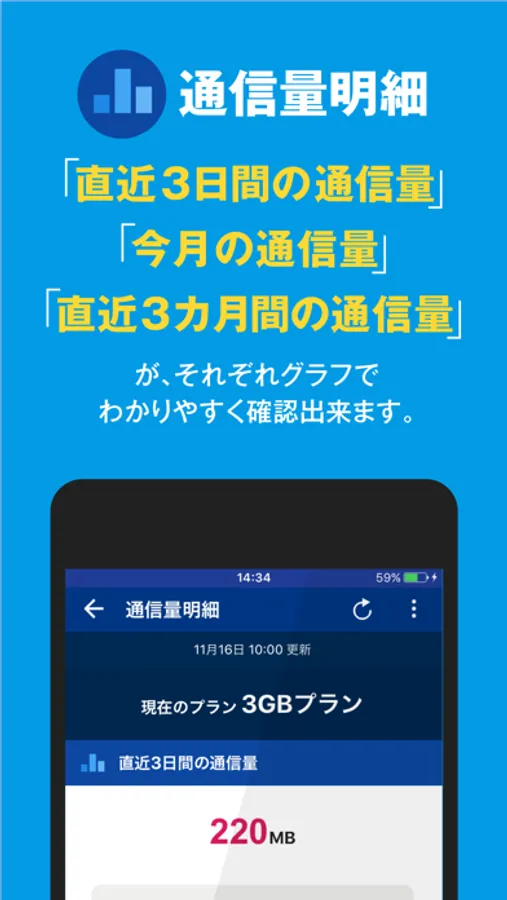 ・本アプリによる通信量の取得につきましては、多くのお客様に快適にご利用いただくため、取得頻度に制限を設けております。そのため、最新の通信量が表示されない場合があります(通信量情報の更新時間については、アプリ画面上に表示されております)。最新の通信量は、通信量明細画面の右上のメニューより「ご利用状況照会」を選択の上、ご利用状況照会のページからご確認いただけます。