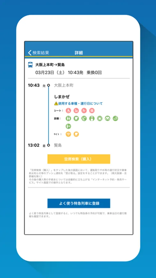 ※当社のインターネット予約発売サービスサイトで、アプリの検索結果と日時・区間等が異なる列車を購入したり、一旦購入した列車を後に変更されたりした場合には、再度、特急空席検索。購入画面からその列車の通知設定を行ってください。