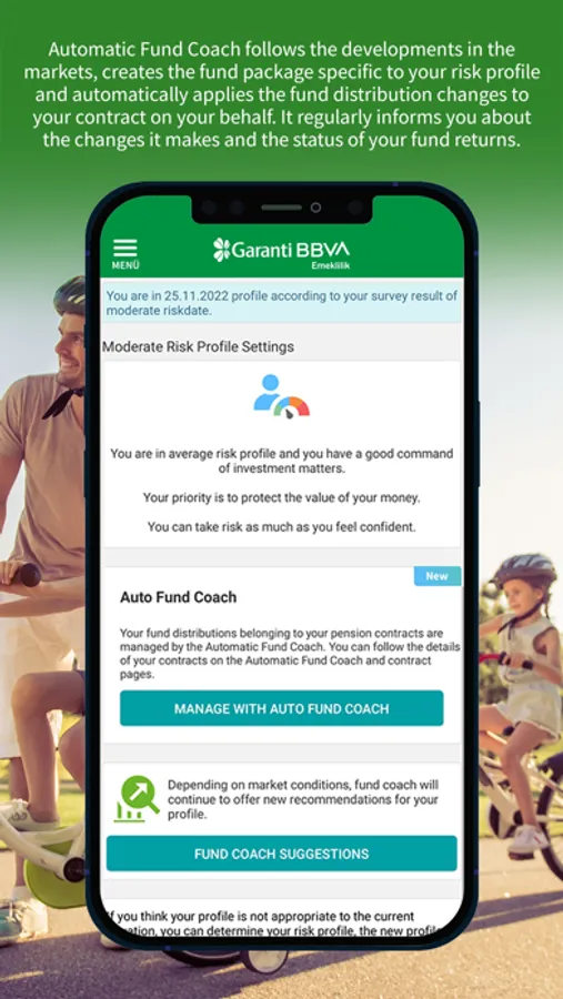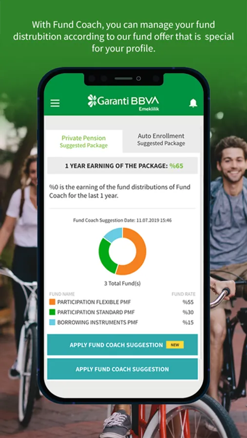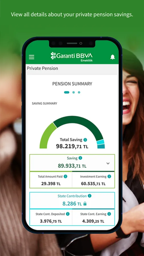 Your private pension, life and unemployment insurance products are always by your side with our Garanti BBVA Pension Mobile app! You can easily login via your Garanti BBVA or Garanti BBVA Pension customer information and view the total saving summaries, fund and risk distributions of the contracts you participate in and see all the details regarding your payments at the “Account Activities” tab.
