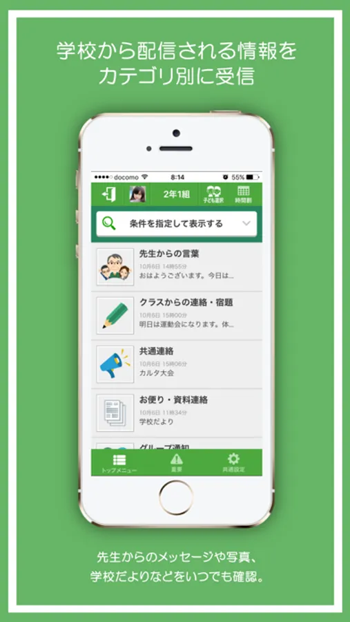 学校から学校行事・授業・部活動などの様子がテキスト・写真・PDFファイル・カレンダーなどを使って配信されます。学校・学年・学級の情報に加え、子どもに紐付けられた保護者様だけに、学校が発信した情報を受け取ることもできます。