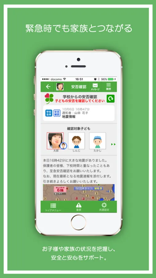 例えば、台風による休校連絡や地域の不審者情報などをスマホで受け取ることや 登録された家族の未読・既読状況を確認することもできます。