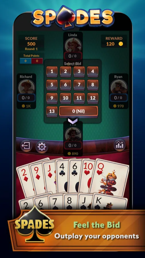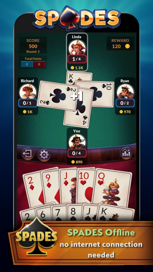 Spades Offline brings this classic 4-player contract trick taking card game to App Store, with the high quality of SNG Games. The main contribution of our game is playing offline Spades plus its challenging opponents with high level artificial intelligence, classy graphics and smooth game play.