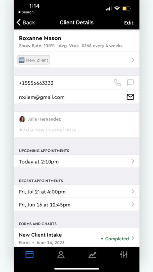 Review client profiles for a refresher on past appointments, previous purchases, social profiles, and more to make every client feel special. You can do this right before their appointment, or even during your morning coffee.