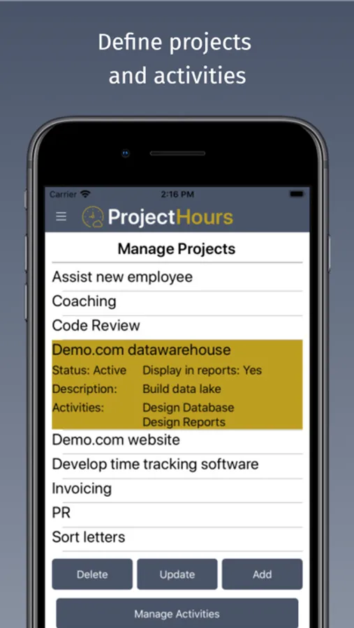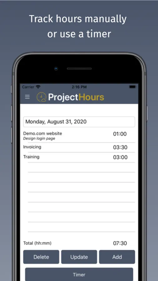 - Use a timer to register time. Timers run on the Project Hours server, no need to keep the app open while working.