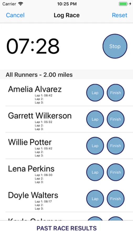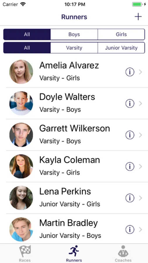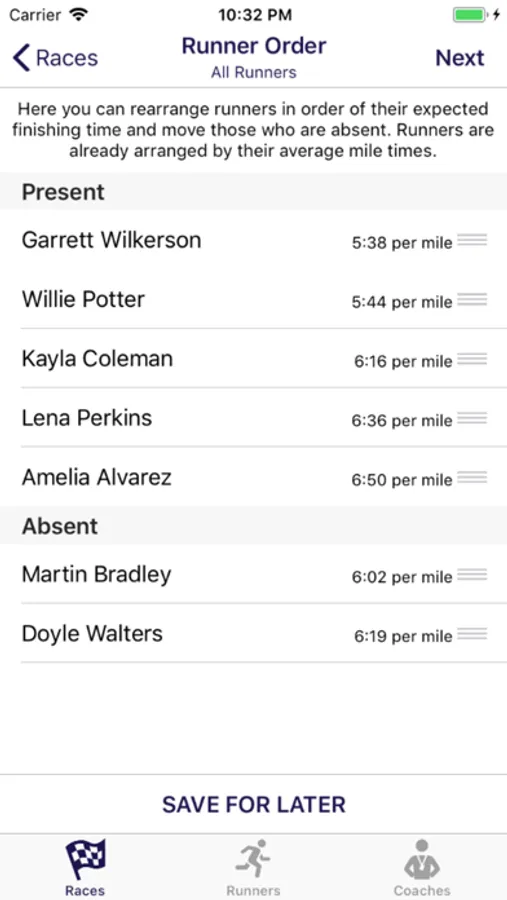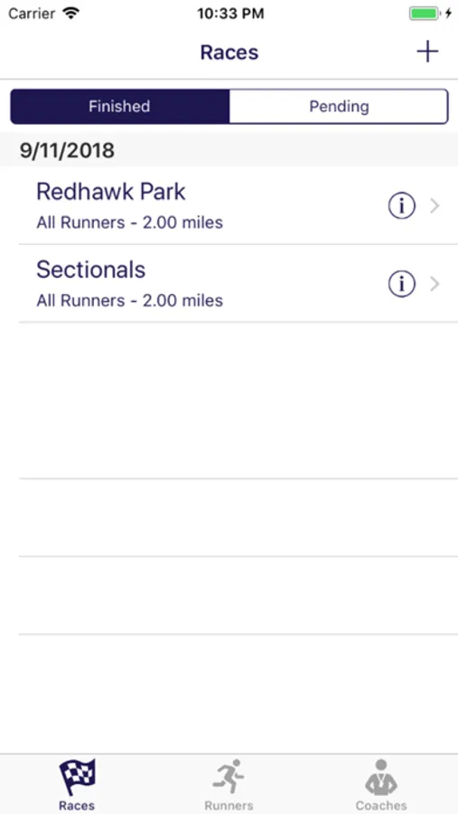 Race Management - Create races with a name, distance, and group (Varsity - Boys, for example), then rearrange runners according to their expected finish time and delete those who are absent. From there, log each of their race times simultaneously, with the option of logging up to 4 laps. View the results and email them. Navigate back to the Races View to see results from past races.