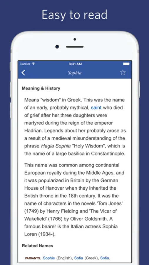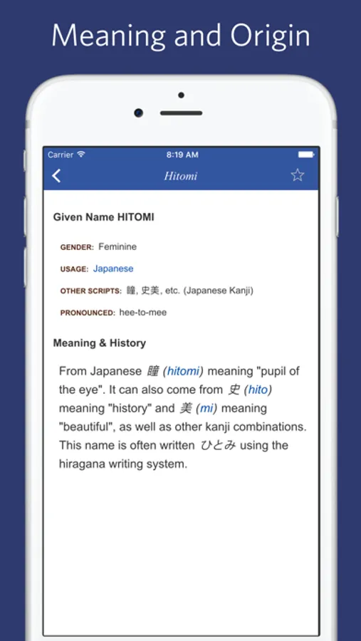 This app provides a dictionary of name with its meaning and origin. Its scope is broad: all given names from all cultures (English, Spanish, Arabic, Japanese, Korean, Irish, Indian, German, Greek, Latin etc.) and periods are eligible to be included in the app. Names from mythology, fiction and bible are also included.
