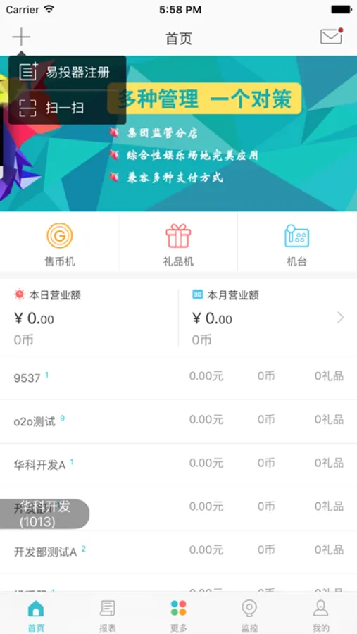 包含多维度的(日、周、月、年、场所)报表查询、多重条件的自定义报表查询、实时数据查询、机台汇总查询、机台明细查询、多维度的营收分析、报表导出打印等功能。