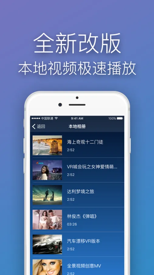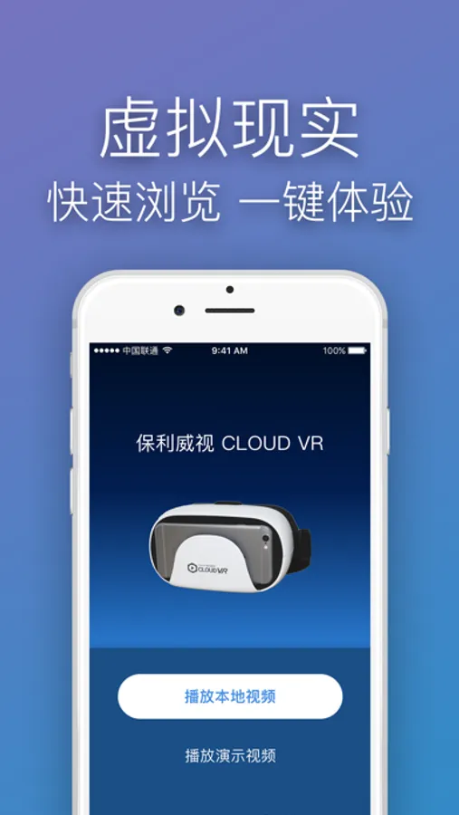 保利威视 cloud VR 播放器是一款本地VR视频播放器,支持360度全景VR视频内容播放,沉浸式体验,可识别手机上所有mp4, mov, m4v等多种主流格式视频,无需转码,无需安装第三方插件。完美兼容VR box ,HTC VIVE,暴风魔镜等全部 VR眼镜设备,随时随地玩转虚拟现实。