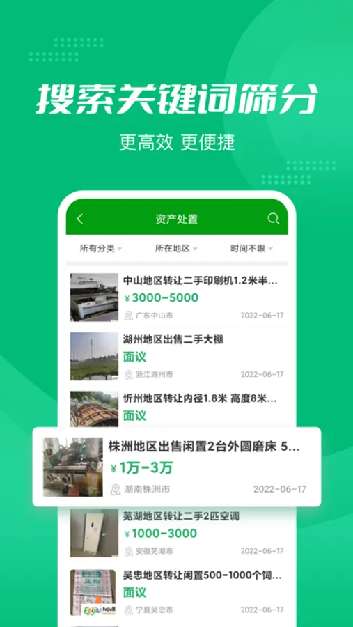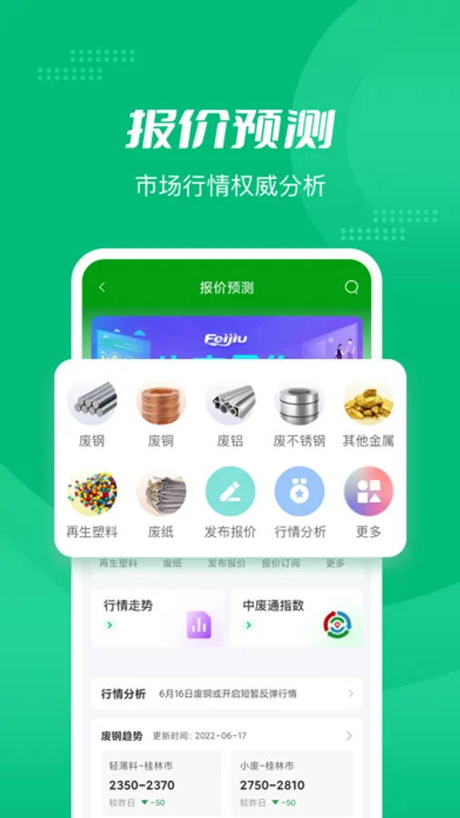 Feijiu网app是中废通旗下的手机客户端,软件主要是提供信息免费发布,供求信息查询,资产处置查询,二手设备讯息查询,库存物资查询,废旧头条浏览等服务。赶快来下载体验吧!