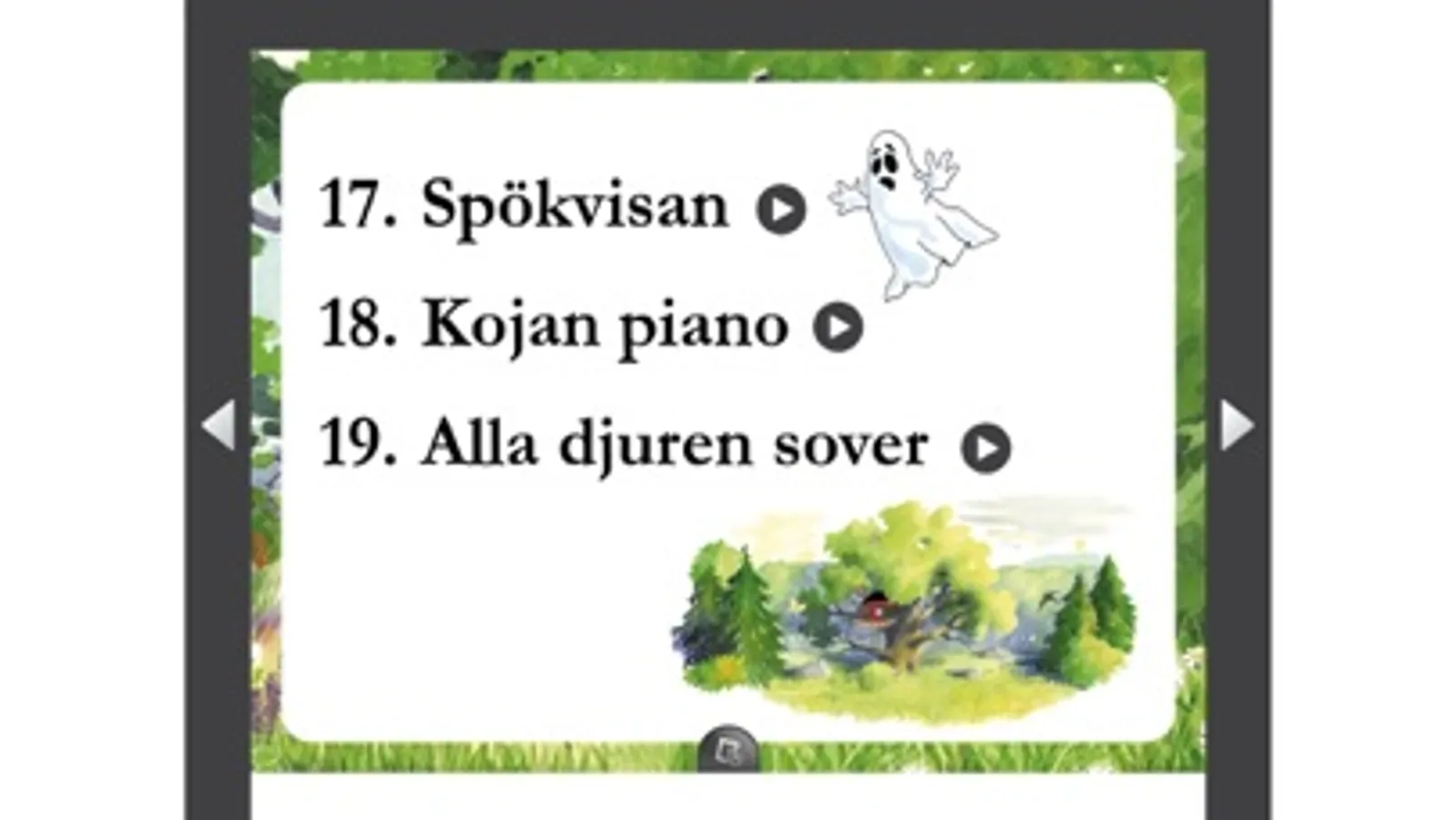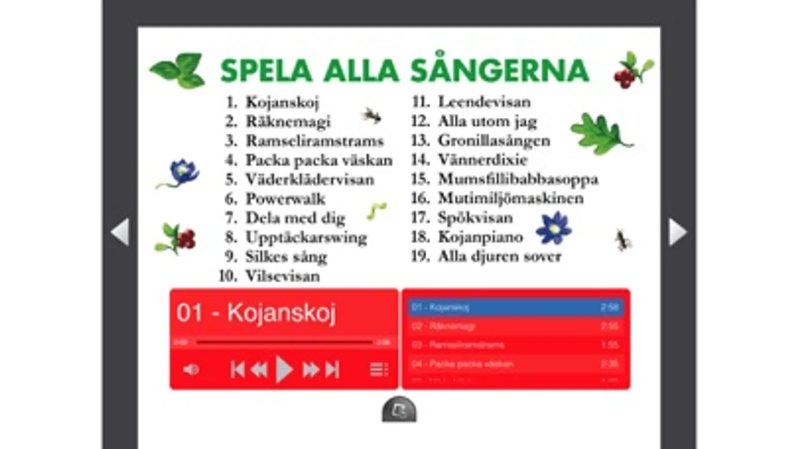 Här finns alla sånger till ”Vännerna i Kungaskogen går på utflykt”, art nr 4666. Istället för att spela sångerna från en CD-spelare kan man nu spela direkt från mobil eller surfplatta. Man kan använda Bluetooth eller minikabel och spela i en högtalare. Barnen kan också sitta själva och på en surfplatta välja vilka sånger de vill lyssna på. Denna app är ett komplement till access Kungaskogen.