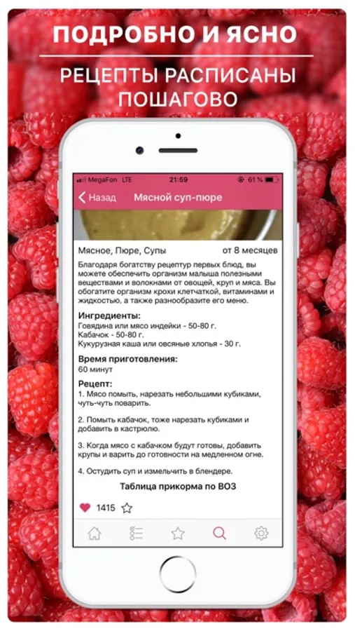 Сейчас в базе приложения уже 1500 рецептов! Мы добавляем новые рецепты почти каждый день! Рецепты отсортированы по возрасту и по типу блюд.