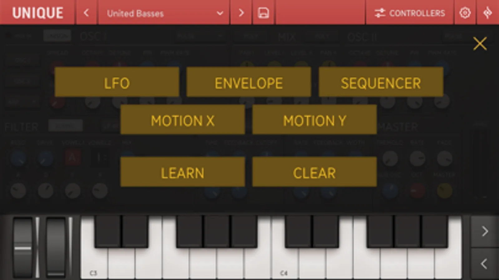 The internal controllers will bring in the dynamics: an LFO and an envelope, there's a recordable XY field & a sequencer. Use these to modulate any knob – a simple long tap will do.