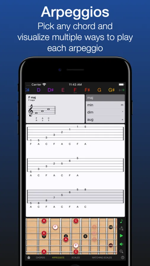 • Thousands of arpeggios patterns generated on selection from a list of more than 200 chord types.