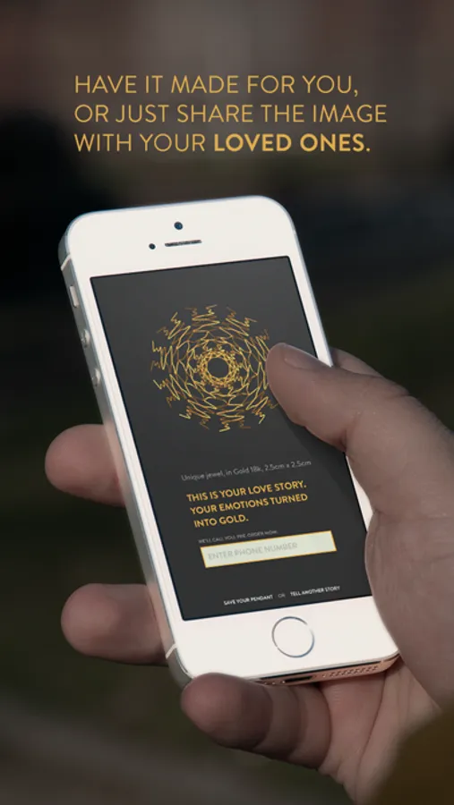 What if you could touch your love story? Carry it always with you or even give it as a gift for a loved one as a physical representation of your feelings? Love Project presents Aura Pendant. A touching experience created to transform emotions into a unique and exclusive jewellery. This app collects the emotions from your love story through voice and heartbeat using sophisticated technology, and transform them into a pendant to be printed in 18k gold.