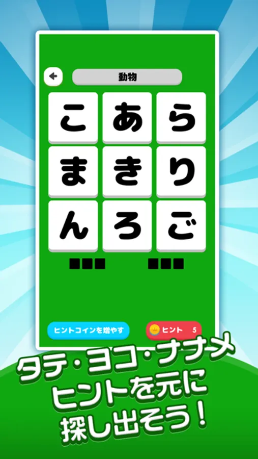 お題を元に、タテ・ヨコ・ナナメに指をなぞって、もじを探してね。
