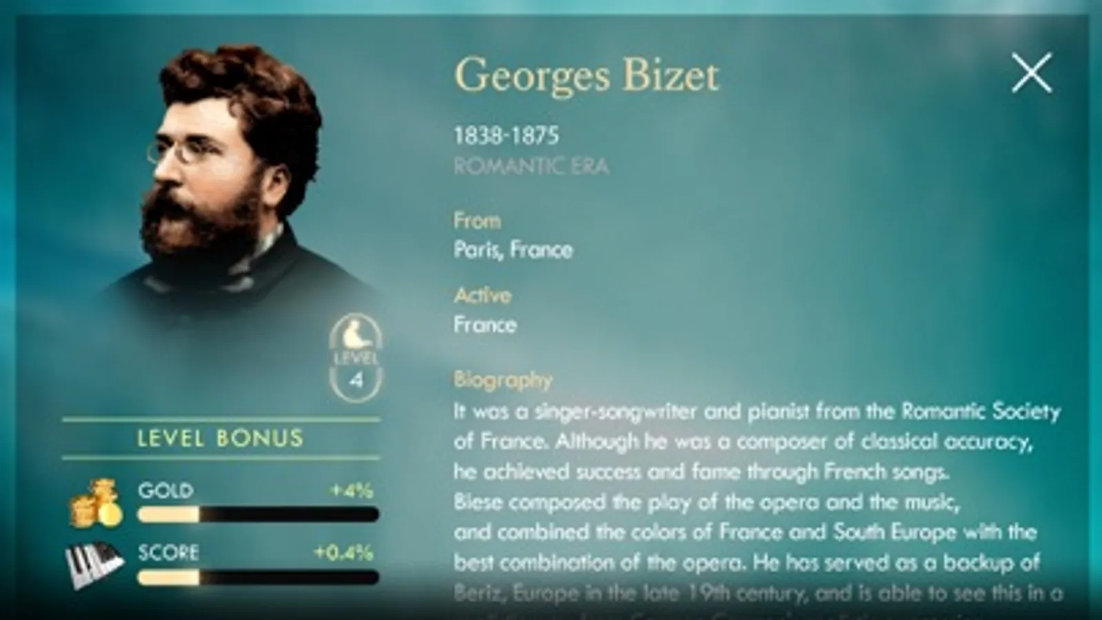 • Composer level system : Play your favorite composer to get score bonus and to earn more gold.