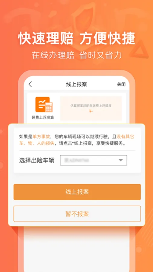 【一键理赔】方便快捷的一键赔(视频查勘)服务,引入4G视频技术,通过手机端即可实现远程查勘、定损,节省理赔时间、提高理赔效率,实现快速理赔;
