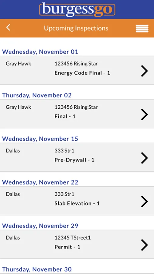 BurgessGo is a mobile application which allows Homebuilders to easily manage their Burgess inspections throughout the construction process. Builders can schedule inspections, view upcoming inspections, see inspection histories for their homes under construction, add new starts, view inspection reports, send inspection reports to trade partners and much more. BurgessGo helps builders be faster and more efficient with the inspection process in order to help speed up production of their homes.