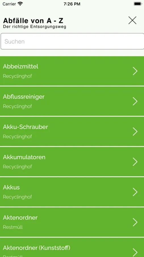 Über das Abfall ABC findet der Bürger alle gewünschten Details zur Abfall- oder Wertstoffsorte, den Entsorgungsweg oder z.B. den nächsten relevanten Standort.