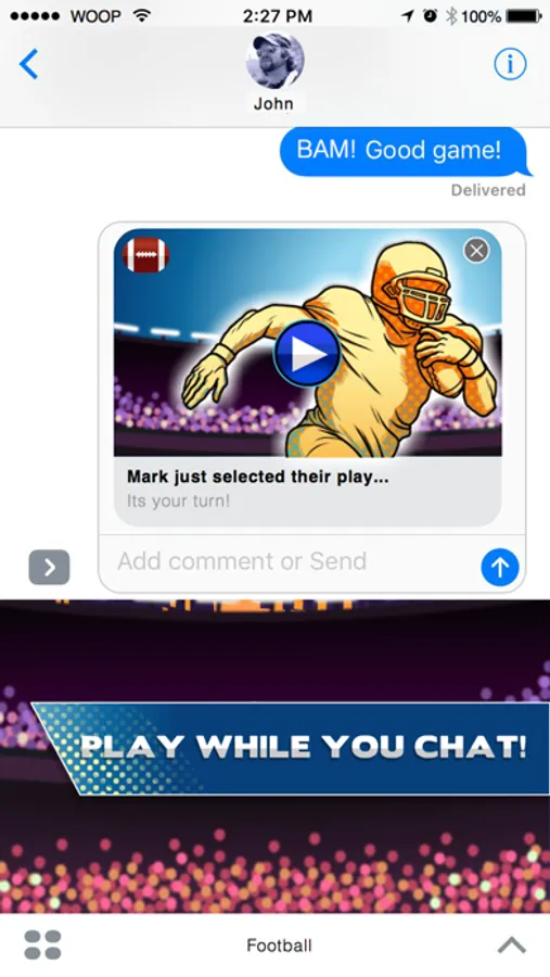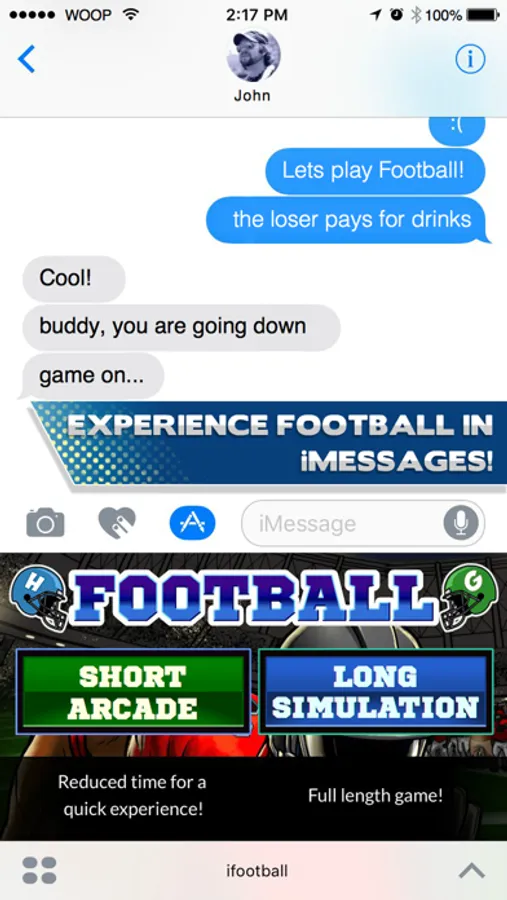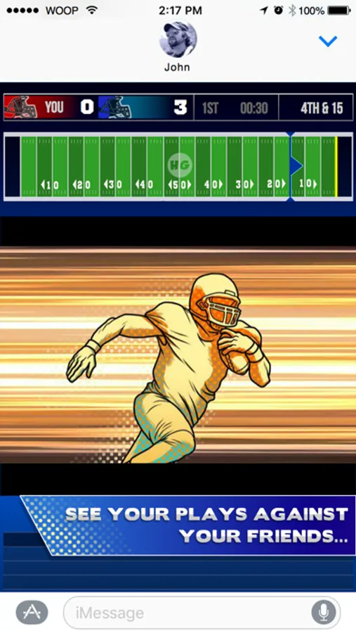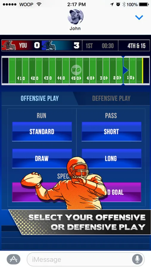 iMessage Football puts the strategy and fun of offensive and defensive play in your hands. Challenge your friends in a play-by-play contest of American Football!