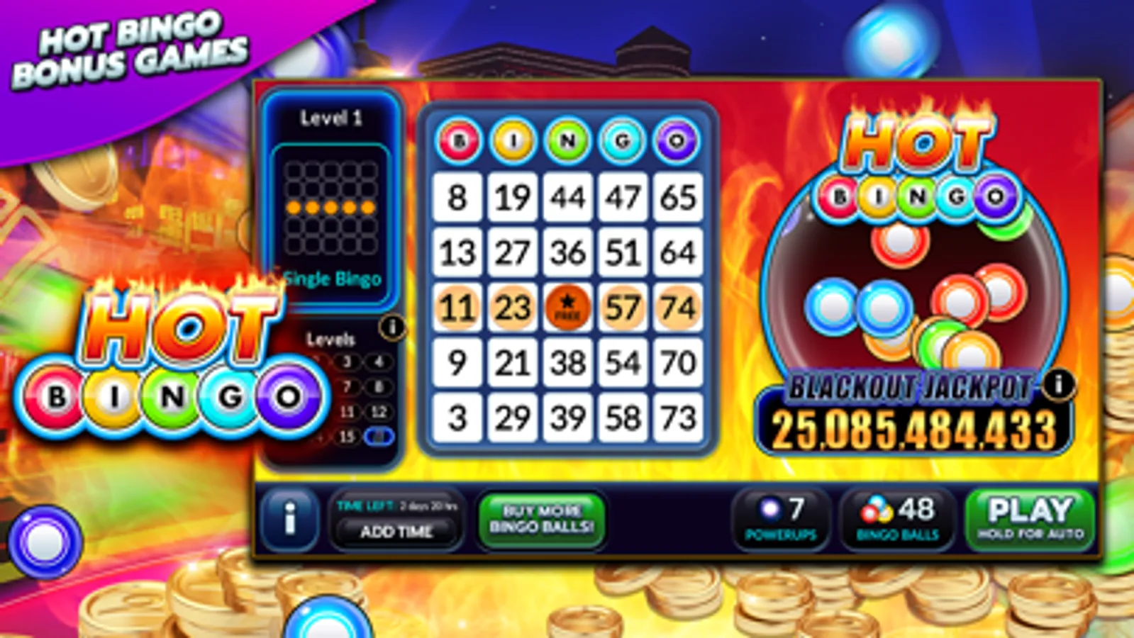 Collect Bingo balls as you spin slot reels to play online Hot Bingo and get a chance to win Blackout Jackpot.